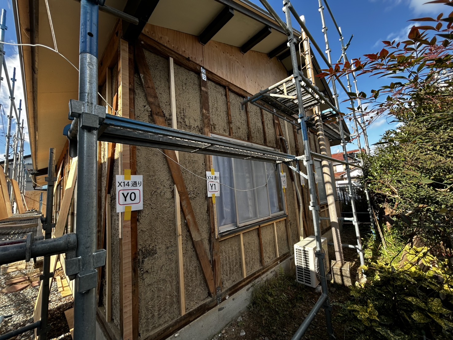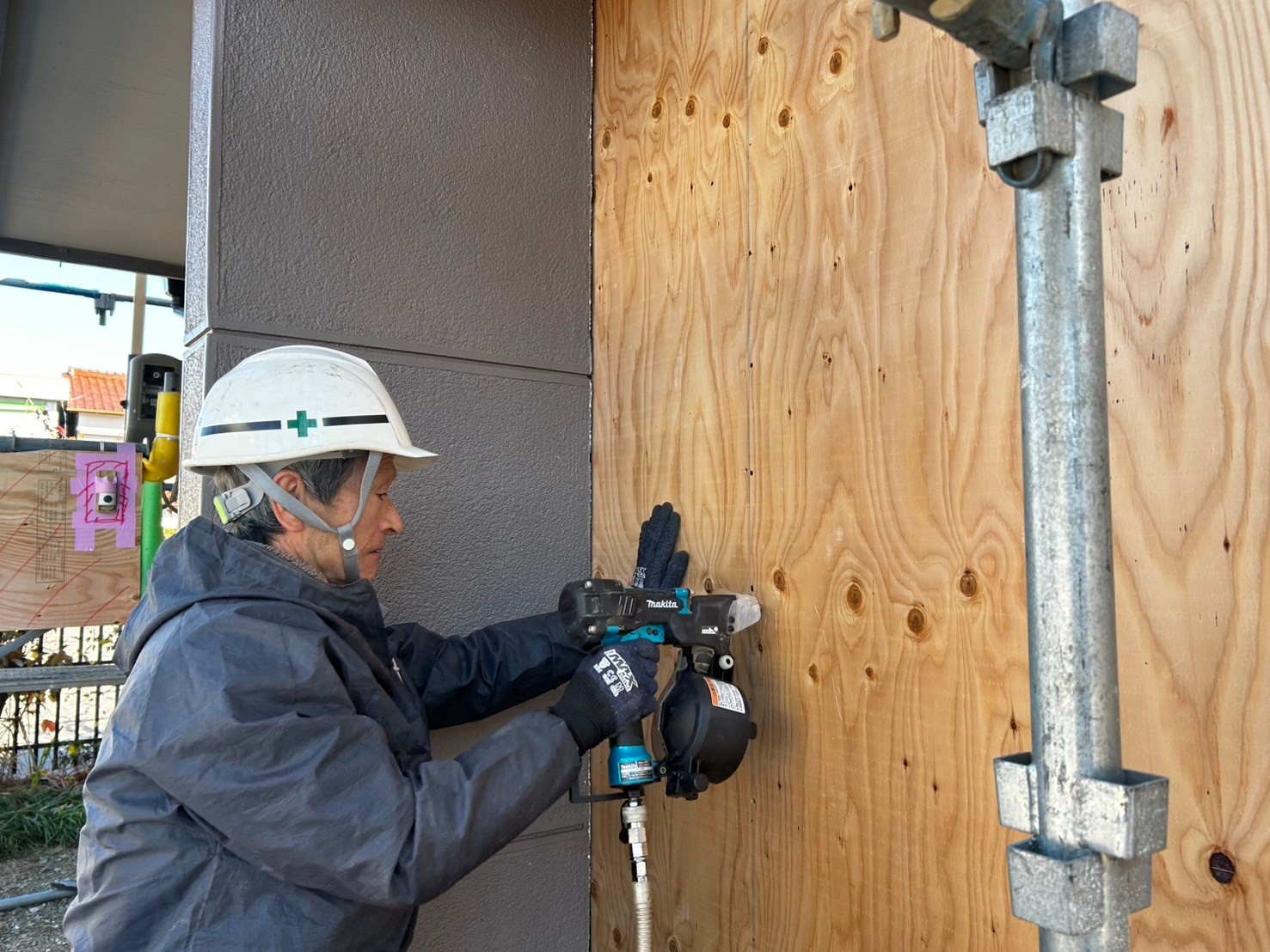 外壁も張り替えるなら、とのことで構造金物+耐力壁による補強工事を実施。